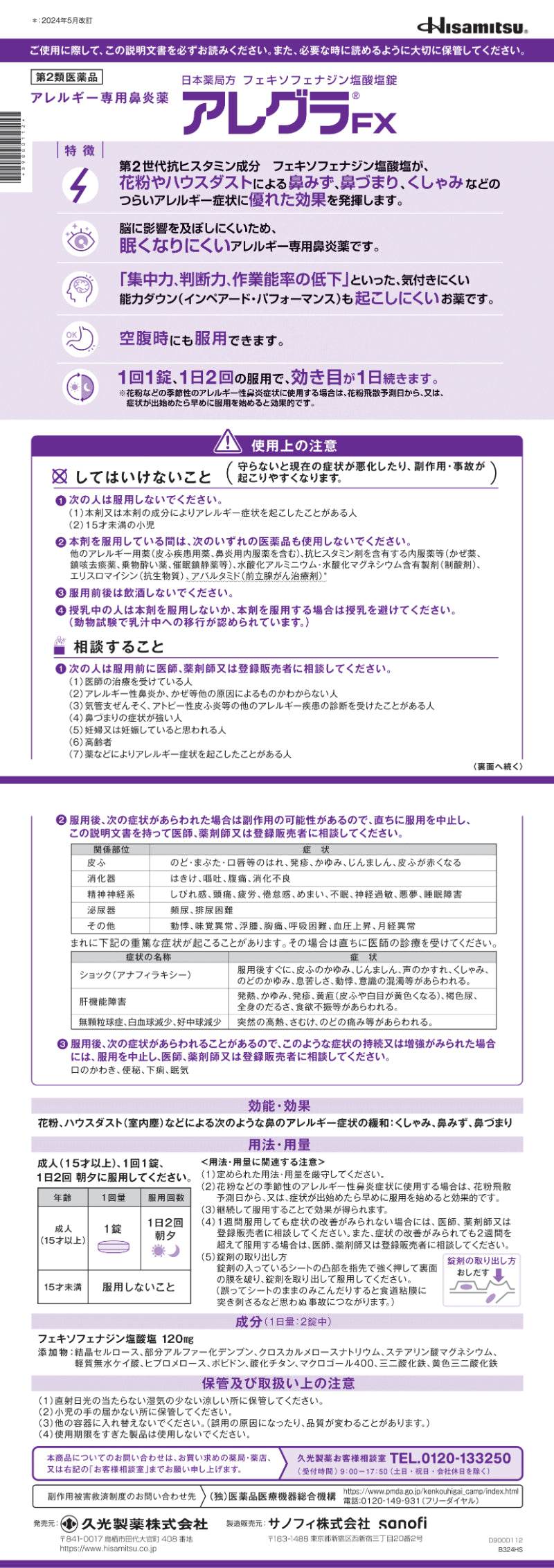 | 注意事項 | ●使用上の注意 <してはいけないこと>(守らないと現在の症状が悪化したり、副作用が起こりやすくなります) 1.次の人は服用しないでください。 (1)本剤又は本剤の成分によりアレルギー症状を起こしたことがある人 (2)15才未満の小児 2.本剤を服用している間は、次のいずれの医薬品も使用しないでください。 他のアレルギー用薬(皮ふ疾患用薬、鼻炎用内服薬を含む)、抗ヒスタミン剤を含有する内服薬等(かぜ薬、鎮咳去痰薬、乗物酔い薬、催眠鎮静薬等)、制酸剤(水酸化アルミニウム・水酸化マグネシウム含有製剤)、エリスロマイシン 3.服用前後は飲酒しないでください。 4.授乳中の人は本剤を服用しないか、本剤を服用する場合は授乳を避けてください。(動物試験で乳汁中への移行が認められています) <相談すること> 1.次の人は使用前に医師、薬剤師又は登録販売者に相談してください。 (1)医師の治療を受けている人 (2)アレルギー性鼻炎か、かぜ等他の原因によるものかわからない人 (3)気管支ぜんそく、アトピー性皮ふ炎等の他のアレルギー疾患の診断を受けたことがある人 (4)鼻づまりの症状が強い人 (5)妊婦又は妊娠していると思われる人 (6)高齢者 (7)薬などによりアレルギー症状を起こしたことがある人 2.服用後、次の症状があらわれた場合は副作用の可能性があるので、直ちに服用を中止し、この説明文書を持って医師、薬剤師又は登録販売者に相談してください。 関係部位:皮ふ 症状:のど・まぶた・口唇等のはれ、発疹、かゆみ、じんましん、皮ふが赤くなる 関係部位:消化器 症状:はきけ、嘔吐、腹痛、消化不良 関係部位:精神神経系 症状:しびれ感、頭痛、疲労、倦怠感、めまい、不眠、神経過敏、悪夢、睡眠障害 関係部位:泌尿器 症状:頻尿、排尿困難 関係部位:その他 症状:動悸、味覚異常、浮腫、胸痛、呼吸困難、血圧上昇、月経異常 まれに下記の重篤な症状が起こることがあります。その場合は直ちに医師の診療を受けてください。 症状の名称:ショック(アナフィラキシー) 症状:服用後すぐに、皮ふのかゆみ、じんましん、声のかすれ、くしゃみ、のどのかゆみ、息苦しさ、動悸、意識の混濁等があらわれる。 症状の名称:肝機能障害 症状:発熱、かゆみ、発疹、黄疸(皮ふや白目が黄色くなる)、褐色尿、全身のだるさ、食欲不振等があらわれる。 症状の名称:無顆粒球症、白血球減少、好中球減少 症状:突然の高熱、さむけ、のどの痛み等があらわれる。 3.服用後、次の症状があらわれることがあるので、このような症状の持続又は増強がみられた場合には、服用を中止し、医師、薬剤師又は登録販売者に相談してください。 口のかわき、便秘、下痢、眠気 ●保管及び取扱い上の注意 (1)直射日光の当たらない涼しい所に保管してください。 (2)小児の手の届かない所に保管してください。 (3)他の容器に入れ替えないでください(誤用の原因になったり、品質が変わることがあります)。 (4)使用期限をすぎた製品は使用しないでください。 |