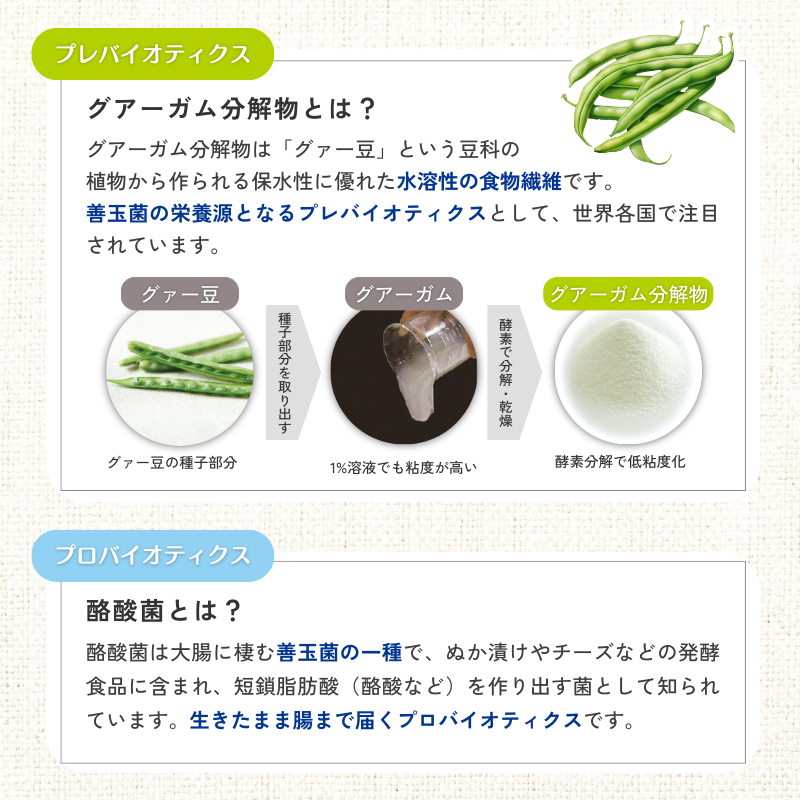 食物繊維(グアーガム分解物*)+生きたまま腸まで届く酪酸菌配合。