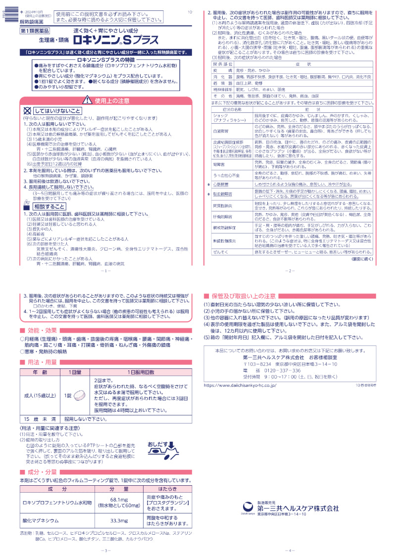 | 成分 | ●成分・分量 本剤は、ごくうすい紅色のフィルムコーティング錠で、1錠中に次の成分を含有しています。 成分:ロキソプロフェンナトリウム水和物 分量:68.1mg(無水物として60mg) はたらき:炎症や痛みのもと【プロスタグランジン】をおさえます。 成分:酸化マグネシウム 分量:33.3mg はたらき:胃粘膜を保護するはたらきがあります。 添加物:乳糖、セルロース、ヒドロキシプロピルセルロース、クロスカルメロースNa、ステアリン酸Ca、ヒプロメロース、酸化チタン、三二酸化鉄、カルナウバロウ |