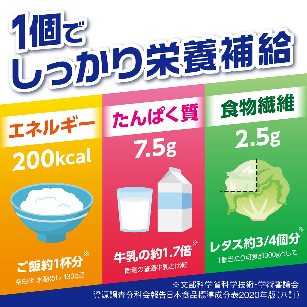 ●たんぱく質7.5g(牛乳の約1.7倍)、食物繊維2.5g(バナナ約2本分)の他、10種類のビタミン、7種類ミネラルなど体に大切な栄養素を1本で効率的に補給できます。