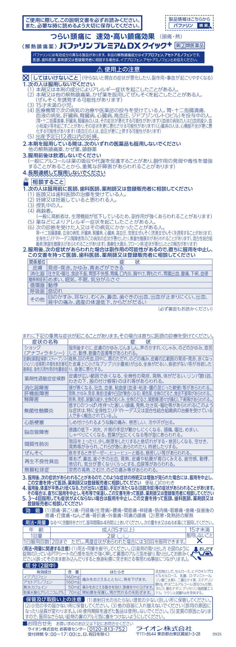 | 注意事項 | ●使用上の注意 <してはいけないこと>(守らないと現在の症状が悪化したり、副作用・事故が起こりやすくなります) 1.次の人は服用しないでください。 (1)本剤又は本剤の成分によりアレルギー症状を起こしたことがある人。 (2)本剤又は他の解熱鎮痛薬、かぜ薬を服用してぜんそくを起こしたことがある人。(ぜんそくを誘発する可能性があります) (3)15才未満の小児。 (4)医療機関で次の病気の治療や医薬品の投与を受けている人。 胃・十二指腸潰瘍、血液の病気、肝臓病、腎臓病、心臓病、高血圧、ジドブジン(レトロビル)を投与中の人。(胃・十二指腸潰瘍、肝臓病、腎臓病の人は、その症状が悪化する可能性があります)(血液の病気の人は白血球減少、血小板減少等を起こすことがあり、その症状を更に悪化させる可能性があります)(心臓病の人は、心機能不全が更に悪化する可能性があります)(高血圧の人は、血圧が更に上昇する可能性があります) (5)出産予定日12週以内の妊婦。 2.本剤を服用している間は、次のいずれの医薬品も服用しないでください。 他の解熱鎮痛薬、かぜ薬、鎮静薬 3.服用前後は飲酒しないでください。(一般にアルコールは薬の吸収や代謝を促進することがあり、副作用の発現や毒性を増強することがあることから、重篤な肝障害があらわれることがあります) 4.長期連続して服用しないでください。 <相談すること> 1.次の人は服用前に医師、歯科医師、薬剤師又は登録販売者に相談してください。 (1)医師又は歯科医師の治療を受けている人。 (2)妊婦又は妊娠していると思われる人。 (3)授乳中の人。 (4)高齢者。(一般に高齢者は、生理機能が低下しているため、副作用が強くあらわれることがあります) (5)薬などによりアレルギー症状を起こしたことがある人。 (6)次の診断を受けた人又はその病気にかかったことがある人。 胃・十二指腸潰瘍、血液の病気、肝臓病、腎臓病、心臓病、高血圧、気管支ぜんそく(気管支ぜんそくを誘発することがあります)、全身性エリテマトーデス(腎障害等のこの病気の症状が悪化したり、無菌性髄膜炎があらわれることがあります)、混合性結合組織病(無菌性髄膜炎があらわれることがあります)、潰瘍性大腸炎、クローン病(症状が悪化したとの報告があります) 2.服用後、次の症状があらわれた場合は副作用の可能性があるので、直ちに服用を中止し、この文書を持って医師、歯科医師、薬剤師又は登録販売者に相談してください。 関係部位:症状 皮膚:発疹・発赤、かゆみ、青あざができる 消化器:吐き気・嘔吐、食欲不振、胃部不快感、胃痛、口内炎、胸やけ、胃もたれ、胃腸出血、腹痛、下痢、血便 精神神経系:めまい、眠気、不眠、気分がふさぐ 循環器:動悸 呼吸器:息切れ その他:目のかすみ、耳なり、むくみ、鼻血、歯ぐきの出血、出血が止まりにくい、出血、背中の痛み、過度の体温低下、からだがだるい まれに下記の重篤な症状が起こることがあります。その場合は直ちに医師の診療を受けてください。 症状の名称:症状 ショック(アナフィラキシー):服用後すぐに、皮膚のかゆみ、じんましん、声のかすれ、くしゃみ、のどのかゆみ、息苦しさ、動悸、意識の混濁等があらわれる。 皮膚粘膜眼症候群(スティーブンス・ジョンソン症候群)、中毒性表皮壊死融解症、急性汎発性発疹性膿疱症:高熱、目の充血、目やに、唇のただれ、のどの痛み、皮膚の広範囲の発疹・発赤、赤くなった皮膚上に小さなブツブツ(小膿疱)が出る、全身がだるい、食欲がない等が持続したり、急激に悪化する。 薬剤性過敏症症候群:皮膚が広い範囲で赤くなる、全身性の発疹、発熱、体がだるい、リンパ節(首、わきの下、股の付け根等)のはれ等があらわれる。 消化器障害:便が黒くなる、吐血、血便、粘血便(血液・粘液・膿の混じった軟便)等があらわれる。 肝機能障害:発熱、かゆみ、発疹、黄疸(皮膚や白目が黄色くなる)、褐色尿、全身のだるさ、食欲不振等があらわれる。 腎障害:発熱、発疹、尿量の減少、全身のむくみ、全身のだるさ、関節痛(節々が痛む)、下痢等があらわれる。 無菌性髄膜炎:首すじのつっぱりを伴った激しい頭痛、発熱、吐き気・嘔吐等があらわれる。(このような症状は、特に全身性エリテマトーデス又は混合性結合組織病の治療を受けている人で多く報告されている。) 心筋梗塞:しめ付けられるような胸の痛み、息苦しい、冷や汗が出る。 脳血管障害:意識の低下・消失、片側の手足が動かしにくくなる、頭痛、嘔吐、めまい、しゃべりにくくなる、言葉が出にくくなる等が急にあらわれる。 間質性肺炎:階段を上ったり、少し無理をしたりすると息切れがする・息苦しくなる、空せき、発熱等がみられ、これらが急にあらわれたり、持続したりする。 ぜんそく:息をするときゼーゼー、ヒューヒューと鳴る、息苦しい等があらわれる。 再生不良性貧血:青あざ、鼻血、歯ぐきの出血、発熱、皮膚や粘膜が青白くみえる、疲労感、動悸、息切れ、気分が悪く
