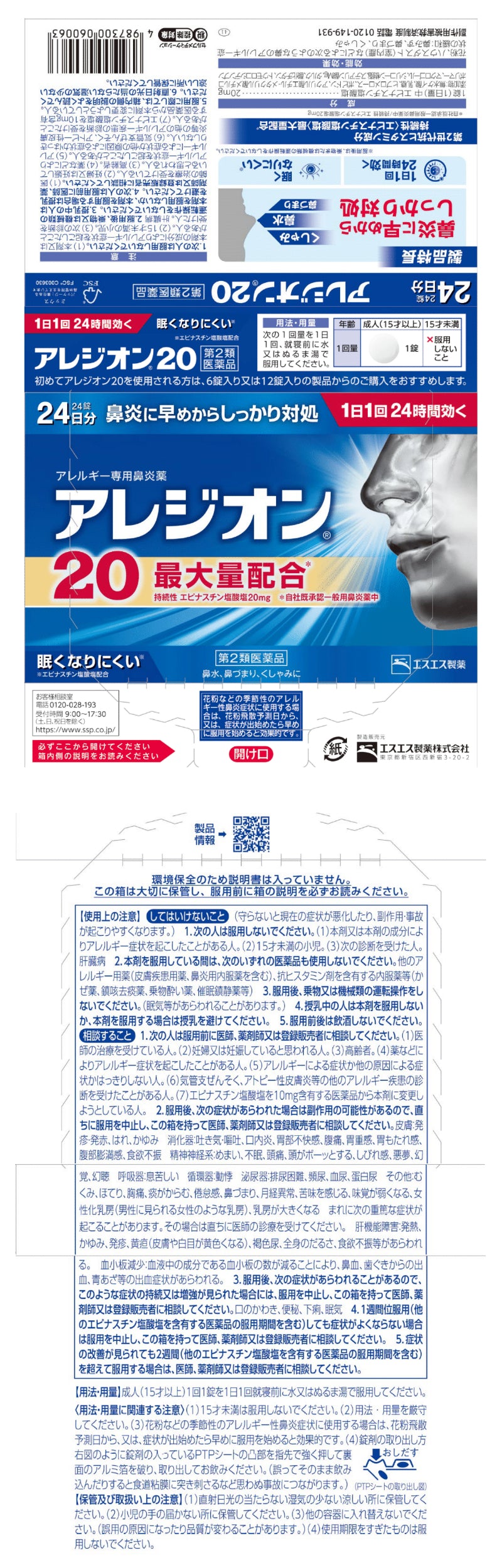 | 成分 | ●成分・分量 成分:エピナスチン塩酸塩 分量:20mg はたらき:花粉、ハウスダストなどによる鼻のアレルギー症状をおさえます。 添加物:無水ケイ酸、乳糖、ヒプロメロース、ポビドン、アクリル酸エチル・メタクリル酸メチルコポリマー、マクロゴール、シリコーン樹脂、ステアリン酸Mg、タルク、酸化チタン、トウモロコシデンプン |