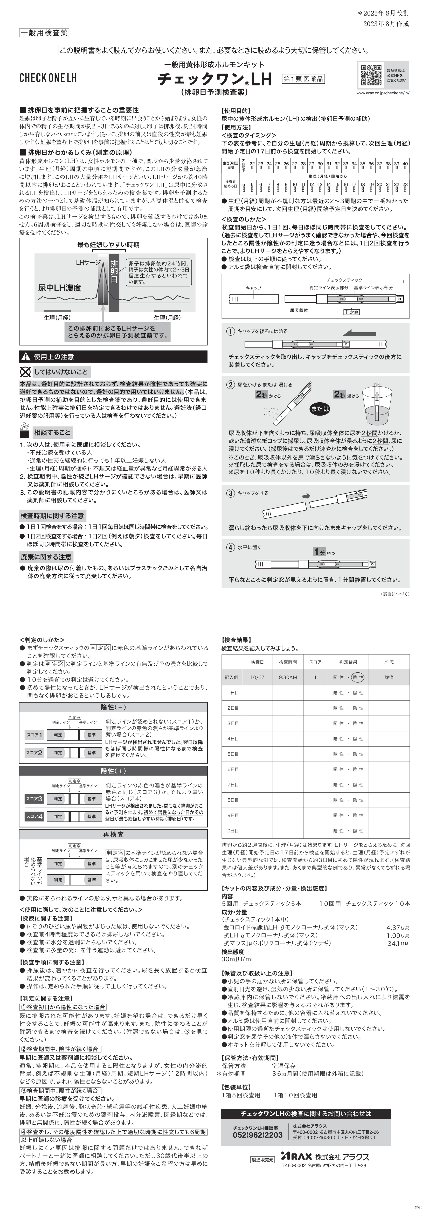 | 成分 | ●成分・分量:チェックスティック1本中 金コロイド標識抗LH-βモノクローナル抗体(マウス)…4.37μg 抗LH-αモノクローナル抗体(マウス)…1.09βg 抗マウスIgGポリクローナル抗体(ウサギ)…34.1ng ●検出感度:30mIU/mL |